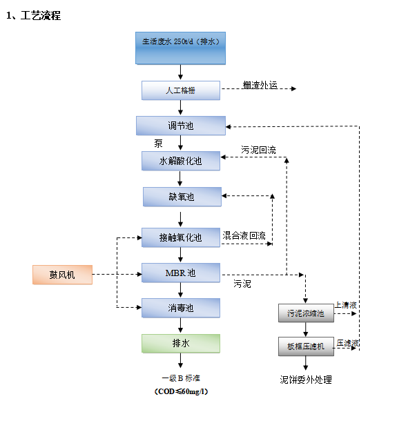 生活污水先經(jīng)過人工格柵,將大型的懸浮物和物塊隔離出來,剩余的廢水進去調(diào)節(jié)池,然后加藥進行處理,在經(jīng)過MBR池處理,處理后的水在經(jīng)過消毒,就可以達標(biāo)排放了。